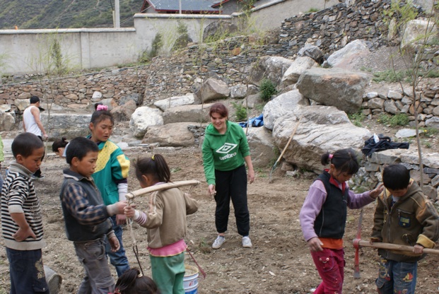 During lunch it started to rain really heavily, which was awful as the big party- the mail event was planned to be an outside event. Zhou Ma’s family had set up a Tibetan tent in the field behind their house but it was raining so heavily that nobody could get up the hill to it. The rain had turned it into a slip and slid. Not beaten by the orphanage experience Johnny and Patches went out in the lashing rain and dug steps into the mud hill. It was a good thing too because the rain didn’t stop until late into the night.