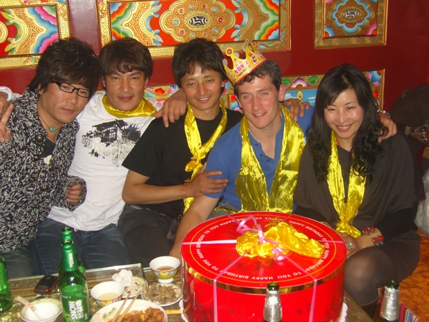 That night, Fitzy’s friends had organised a traditional Tibetan birthday dinner for him and had rented a room in a local restaurant. When we arrived at the restaurant there was a welcoming ceremony. To get into the restaurant you have to pass through an arch and at the arch were three Tibetan girls, one with a teapot, one with a cup and another with Yellow scarves. We had to enter in single file, drink from the teacup and then the third girl put a yellow scarf around our necks. This symbolises health and good fortune. So I went up and received the cup and knocked it back. I have never tried so hard not to wince at the taste and the shock, (for fear of being disrespectful). I didn’t know it at the time but it wasn’t tea inside the cup at all, it was fecking barley wine! A particularly pungent drink, that happens to be the same colour as tea. Of course like those before me I wasn’t able to warn the person behind me as I had already passed through the arch so all 14 of us had the same surprise!