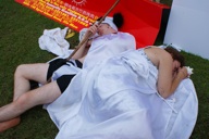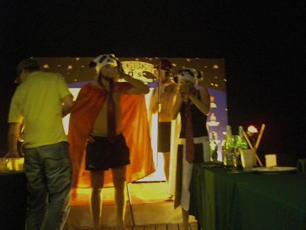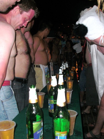 On Saturday night there was a buffet dinner and beach party organised in one of the fancier hotels. Everyone arrived and ate and drank their fill and then the boat races and forfeits started. The boat races are drinking games. Two teams play against each other. 10 players from each team sit along a table facing one another. Each payer is then given a pint of beer. He or she has to down their beer as quickly as possible. Only when their empty cup is placed upside down on their head can their team-mate start their drink. It goes down through the lines and the last team to finish wins.