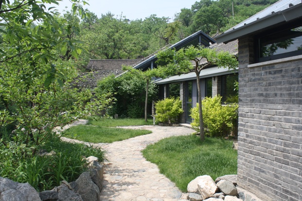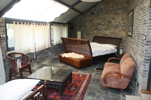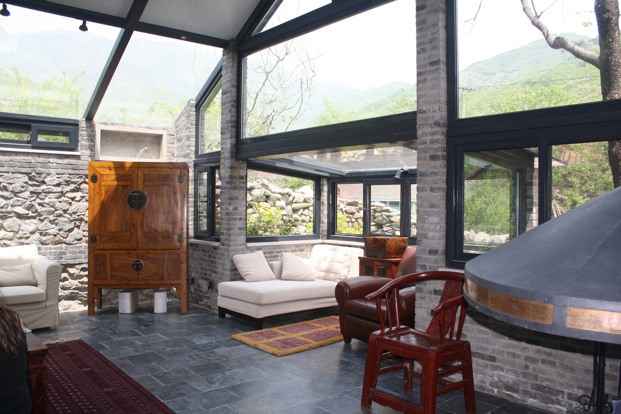 The house is amazing. It is beautifully designed and decorated in a modern style - open plan kitchen cum dining, with a living room behind. All the doors are glass giving beautiful views of the garden and mountains, where the Great Wall is nestled. The doors all open out onto the garden which had a really rustic feel with stone walls, modern furniture and a well fire in the patio. Inside the style is East meets West. The main design is western such as the island in the kitchen, big cream couches and the chrome fittings in the bathrooms but there are also key pieces of antique Chinese furniture such as the kitchen cabinets, bathroom cabinets and bedroom lockers. The master bedroom is split level and the top floor has a Chinese wedding bed. (Similar to a four poster bed only it is boxed in so that you can only get in and out by one side.)