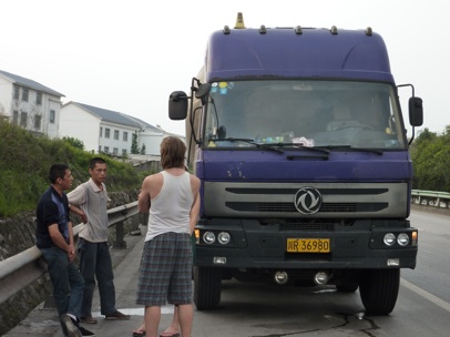 We were in the fast lane overtaking a fuel truck and we have beeped (as required). We are doing about 112km/hr and are just behind his drivers window when he decides to pull into the fast lane. Colm was driving and starts braking and honking the horn, but the truck is completely oblivious. We are moving closer and closer to the metal dividing barrier, Colm is braking as much as the jeep will allow without turning or toppling, the truck is still closing us not slowing a bit, luckily he only clipped the front corner of our bumper but he drove on without even noticing. At this, in a complete adrenalin fuelled fury, we raced up after him beeping and flashing and waved him down. I was petrified and fully aware that had he hit us anywhere else we would have toppled over the barrier and onto the other side of the motorway, or worse ended up in a big petrol bomb. Colm on the other hand was furious. He shouted and screamed at the driver and looked close to punching him for nearly killing us. In the end, after a huge fight, with the driver who tried to deny the whole thing, we anxious to get away, (and off the hard shoulder) we settled for 300RMB or 30 euro, not much considering we nearly died! But the damage to the jeep didn’t seem much, and labour in China is cheap. It wasn’t until after that we learned we had an oil leak as the bumper is attached to the main chassis which had shifted and cracked the engine.