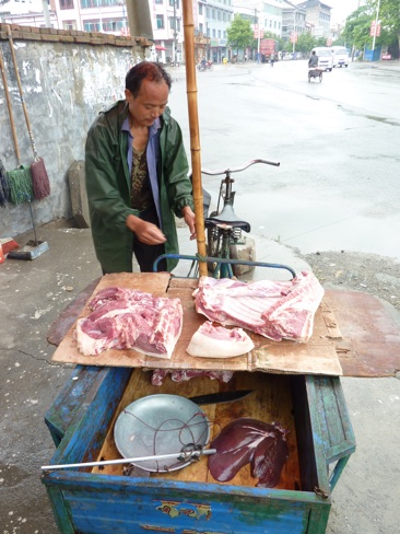 The coolest thing about driving through a country is that you see things that you would never normally see on a bus. You can stop wherever you like. Most of the towns we stopped in were jammed with the nicest people. We couldn’t sit in a restaurant without each of us being presented with a cigarette at least twice (even though only one of us smoked). People were so kind, the people that stopped to help when we got hit by the truck, the guy who hopped on his bike and led us to the bank when we only wanted directions, the woman that made us dinner at 11.30pm and wouldn’t let us pay, the standing ovation we received from the bystanders when we sorted our tarp. Not only that but we also get to see parts of Chinese life that you don’t normally get to see like the butcher below (This is for you Dad!!!):